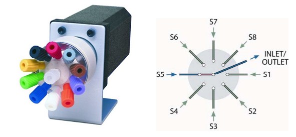 MCV-8-1/8多通道選向閥通過不斷旋轉可以連續切換。每一步選擇8條流路中的一條,控制它由閥的出口到進樣閥,未被選擇的流路端口是閉塞的。